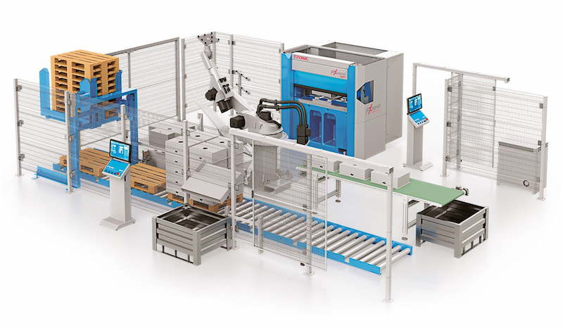 Идеальное решение для заготовок размером до 1500 x 800 мм. Робот большой производительности с двумя различными конфигурациями разгрузки, которые можно регулировать в зависимости от производительности клиента.
